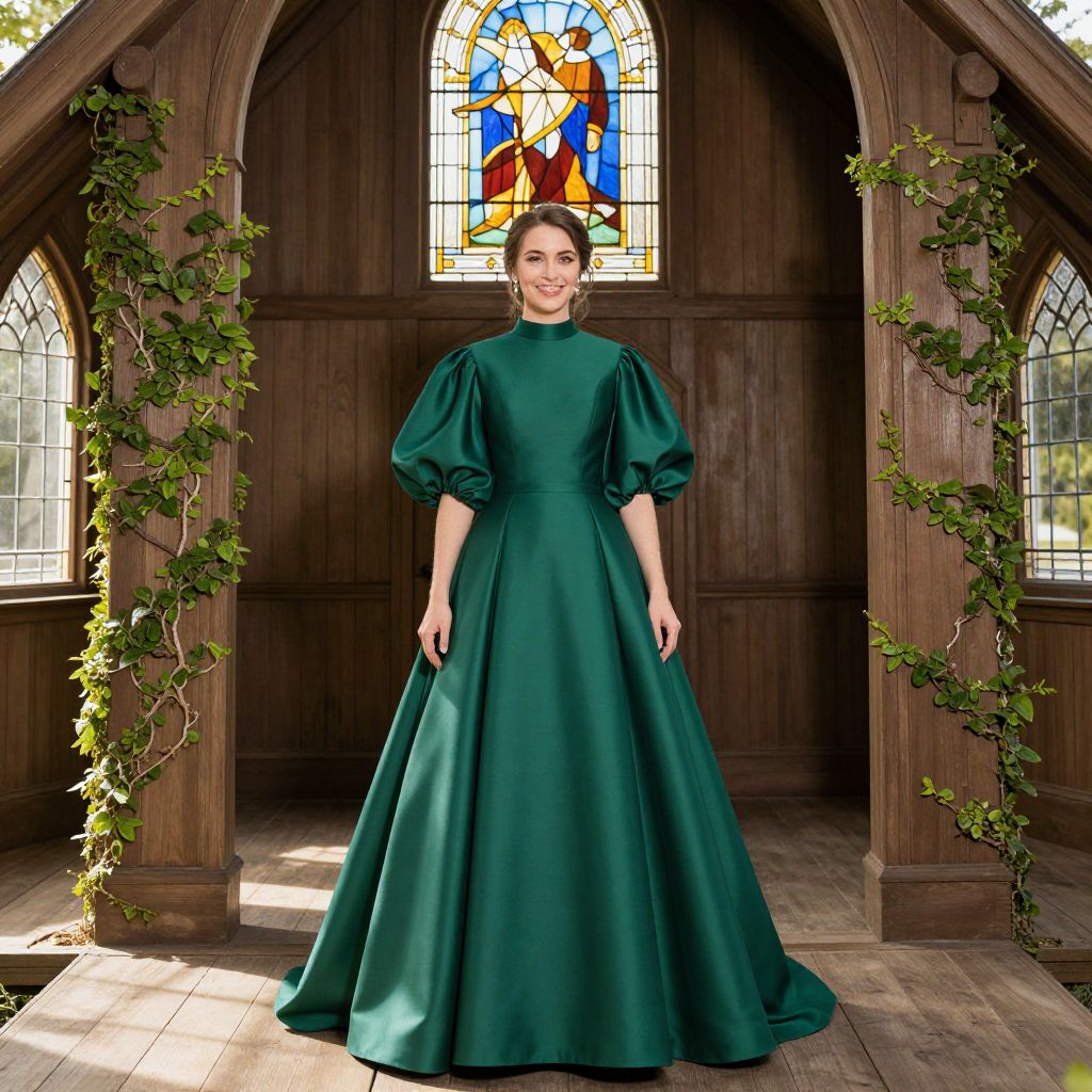 A elegant bride in her late 20s with fair skin, high cheekbones, and a warm smile is dressed in a classic green wedding gown with a high neckline and voluminous sleeves, standing under a vintage wooden chapel with ivy-covered columns and soft afternoon sunlight streaming through the stained glass windows.