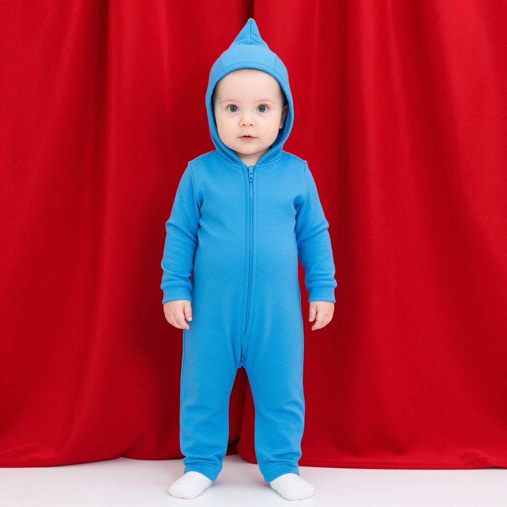 Photograph of a baby standing against a vibrant red curtain backdrop. The baby, with fair skin and blue eyes, wears a bright blue, hooded onesie with a pointed hood, resembling a wizard's hat. The onesie has a zipper down the front and white socks peeking out at the bottom. The baby's expression is neutral, with lips slightly parted. The red curtain has a rich, textured fabric appearance, adding contrast to the baby's blue outfit. The floor is white, providing a clean, simple background. The overall composition is simple and focused on the baby.