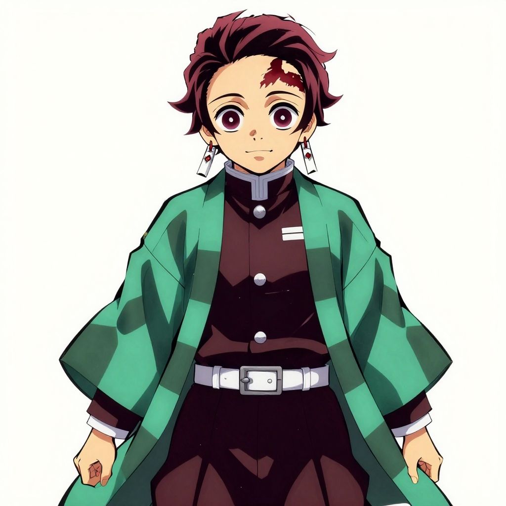 Kimetsu no yaiba style, kamado tanjiro, demon slayer uniform, 1boy, male focus, scar on face, weapon, scar, earrings, teeth, jewelry, pants, scar on forehead, brown hair, belt, black pants, japanese clothes, haori, green haori, solo, red eyes, long sleeves, anime coloring
