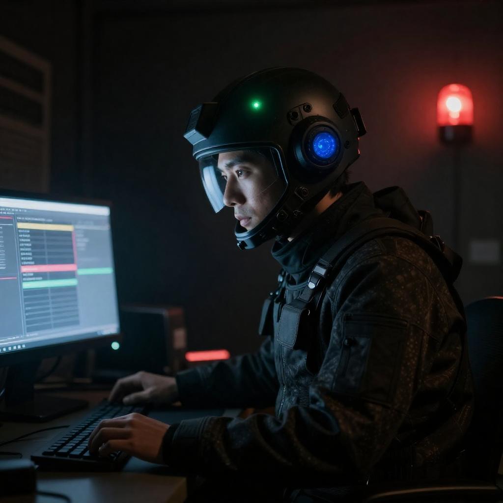 Silhouetted figure in a dark room, wearing a helmet and tactical gear, holds a gun with both hands. Bright light from a window behind creates strong contrasts and red laser beams cross the image. Shadows and light create a dramatic, intense atmosphere.