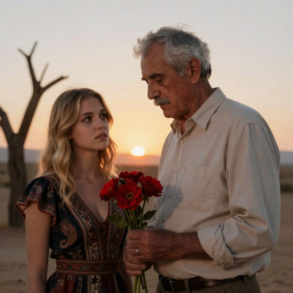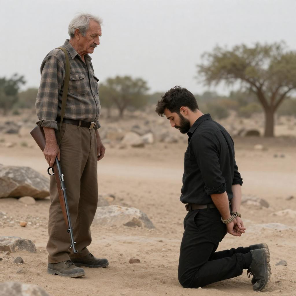 Old man with gray hair, plaid shirt, and brown pants holding a rifle, standing to the left. Young man with dark hair and beard, black shirt, and black pants, kneeling with hands tied behind back to the right. Deserted rocky area with trees in background. Old man looking at young man. Young man looking down. Overcast sky.