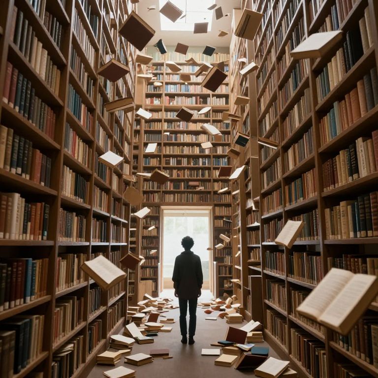 In a labyrinthine library where books float like whispers in a celestial sea, a solitary figure stands amidst scattered knowledge, embodying the quiet tension between the infinite allure of discovery and the isolating weight of unanswered questions.