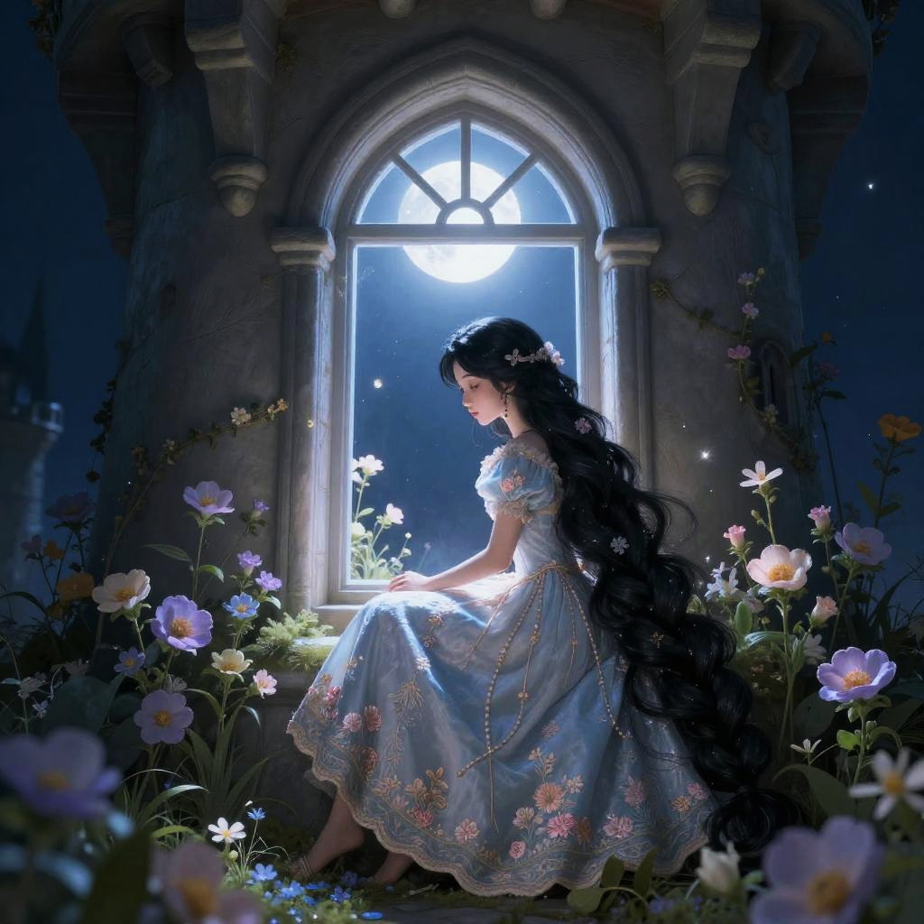 Rapunzel looking out the window from her high tower prison, her flowing golden hair shimmering in the sunlight, surrounded by lush ivy and blooming flowers, enchanted forest visible beyond, whimsical and magical mood with intricate details.