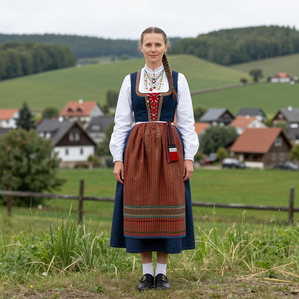 Photograph of a young Caucasian woman standing in a lush, green countryside. She has light skin, brown hair in a braid, and wears a traditional Bavarian outfit: a white blouse with puffed sleeves, a dark blue dirndl dress with red and brown embroidery, and a red apron. She also has white socks and black shoes. The background features rolling hills, a wooden fence, and several red-roofed houses scattered across the green landscape. The sky is overcast, and the image is brightly lit, highlighting the vibrant colors and textures of her attire and the surrounding environment.