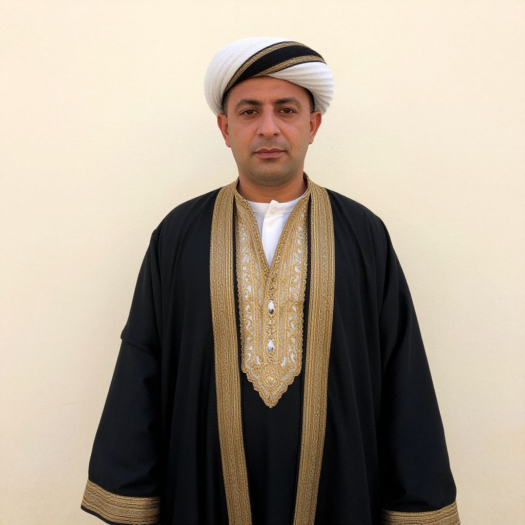 "Tunisian Traditional Clothing, man in a turban and headdress standing in front of a wall"