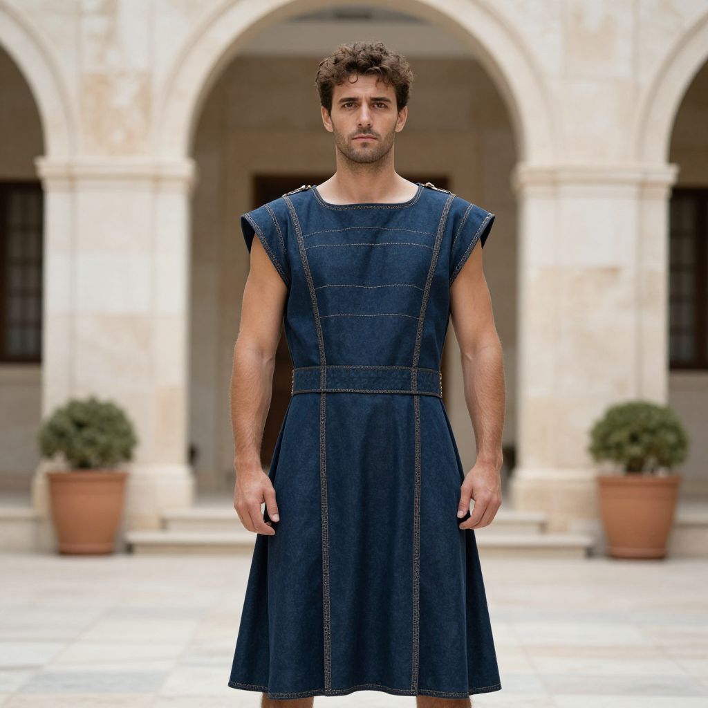 Greek traditional man dress, man in a blue roman costume standing in front of a building