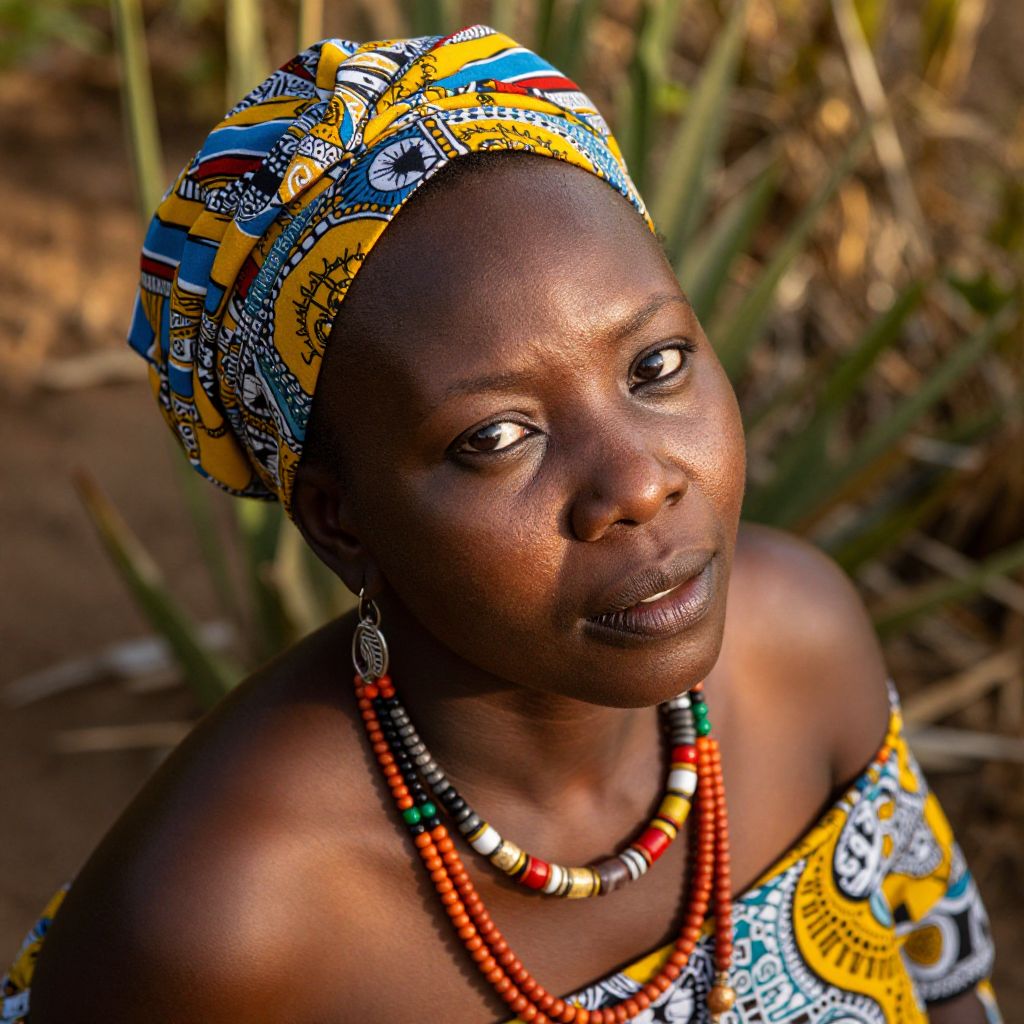Photograph of an African woman with dark skin, wearing a colorful patterned headwrap, beaded necklace, and matching fabric dress, looking slightly to