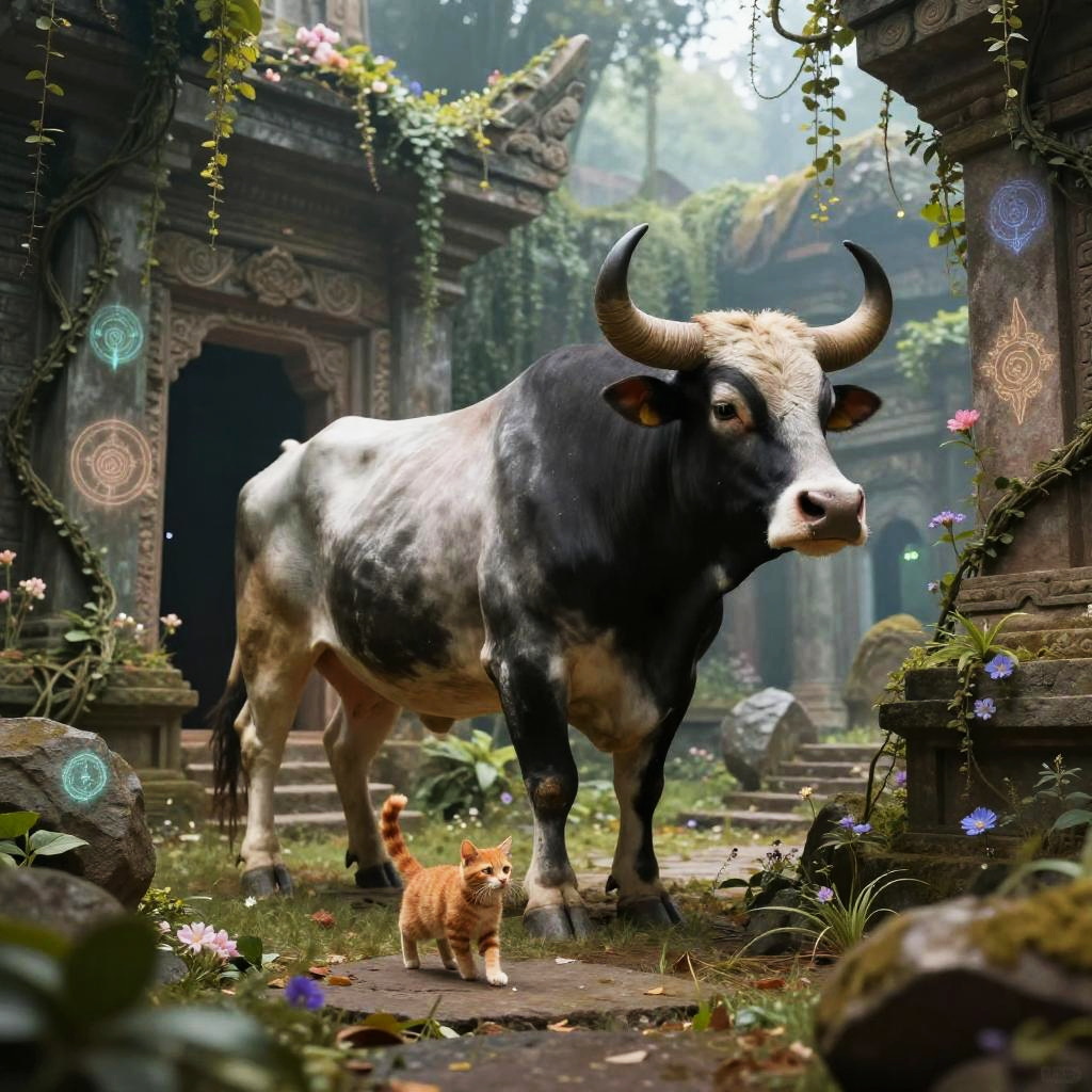 An ox and a red cat resting under a large old oak tree near a rustic barn, early morning mist with dewy grass, soft natural lighting, cozy rural scene rendered in a painterly style with focus on natural textures and gentle expressions on the animals.