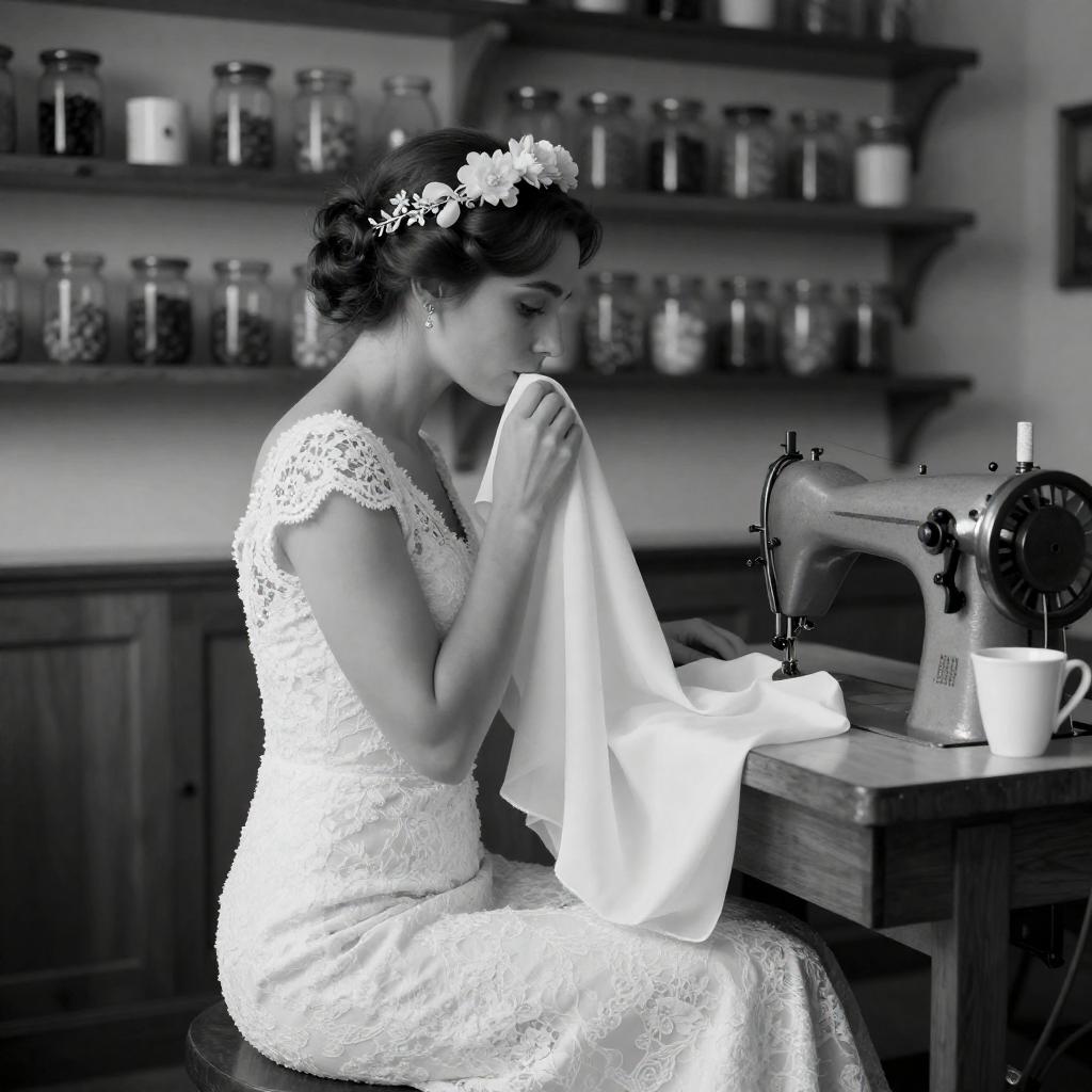 Black and white photograph of a woman in a lace wedding dress and floral headpiece, sitting at a sewing machine, holding a piece of fabric to her mouth. Shelves with glass jars in the background. She has a focused expression. Sewing machine on the right, fabric draped on it. Wooden floor and shelf. One cup on the table. Side profile.