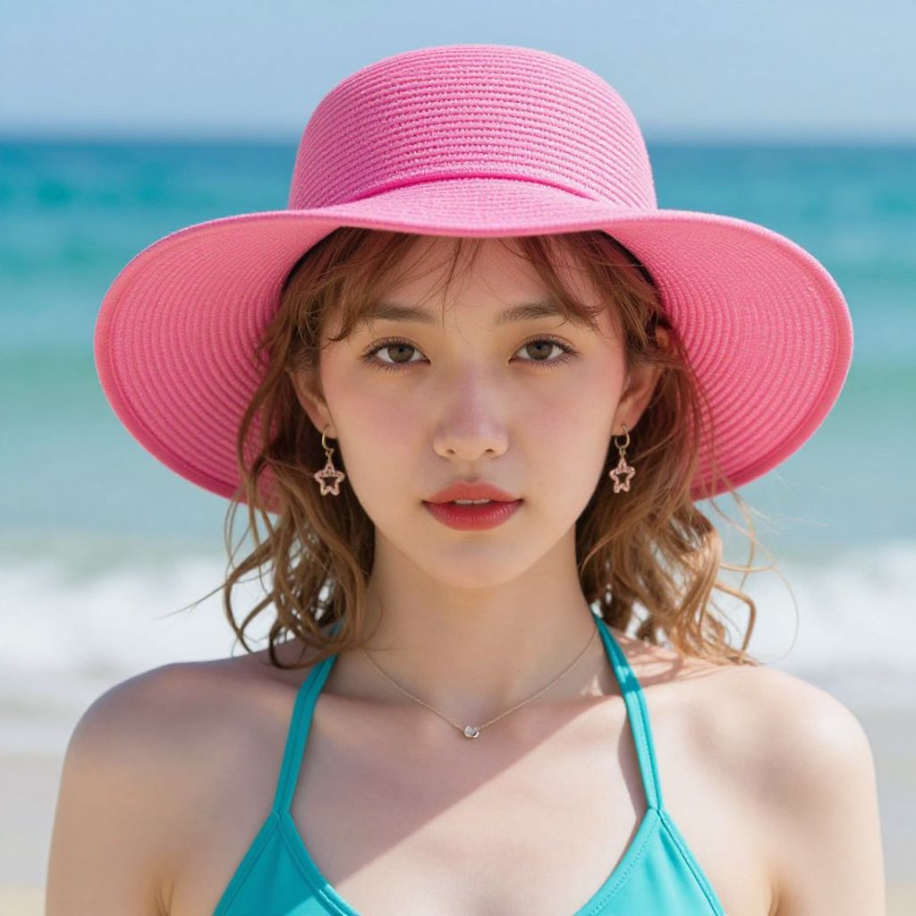Photograph of an Asian woman with fair skin, wavy brown hair, and brown eyes, wearing a bright pink wide-brimmed hat and a teal halter bikini top. She has star-shaped earrings and a delicate necklace with a small pendant. The background shows a clear blue sky and a turquoise ocean with white sand. The sunlight highlights her face and hat, casting soft shadows. Her expression is calm and slightly smiling. The image is sharp with vibrant colors, focusing on her from the shoulders up.