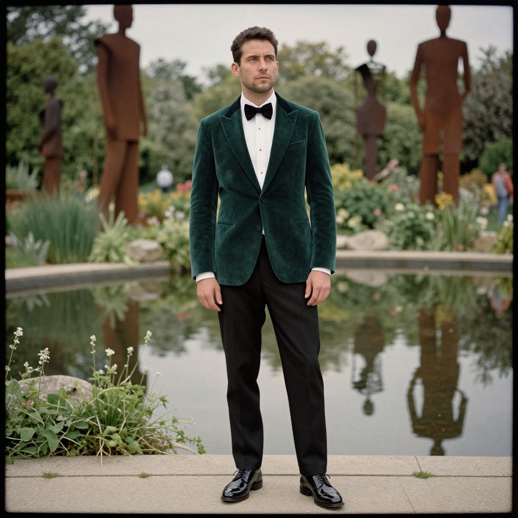 A man, burgundy velvet blazer, light gray dress shirt, slim-fit black chinos, suede black loafers, patterned black pocket square, sun-drenched courtyard, vibrant sculptures, hand-tinted photograph, confident expression. Man has masculine face and piercing eyes