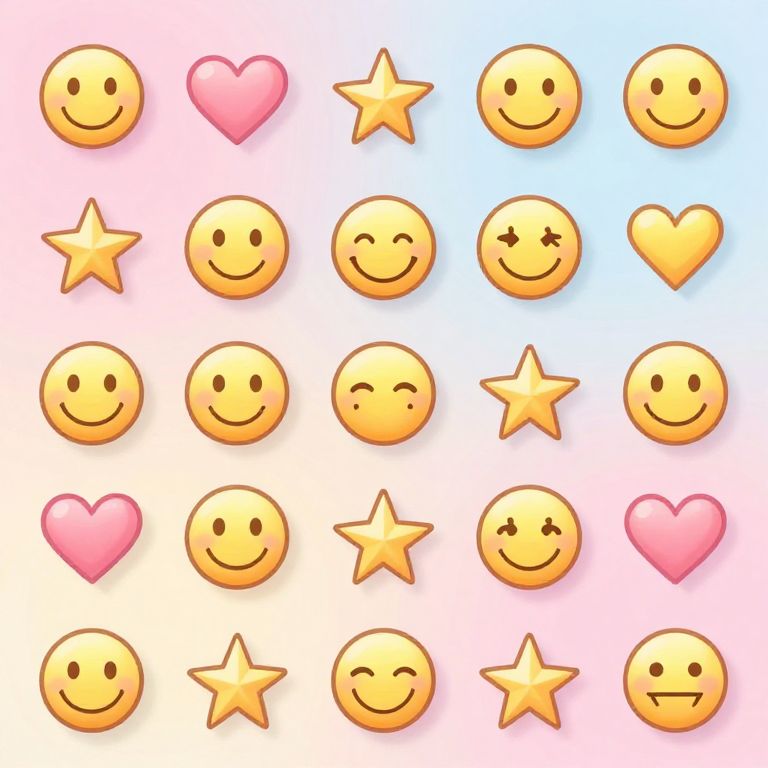 Grid of 16 colorful emoji: yellow smiley faces, pink hearts, yellow stars, on pastel pink and blue gradient background. Digital illustration.