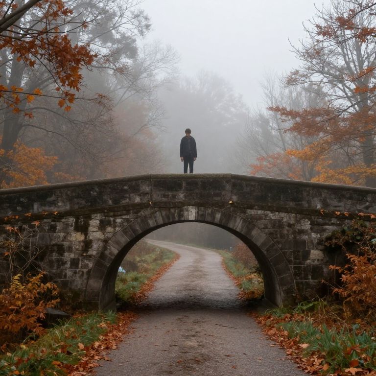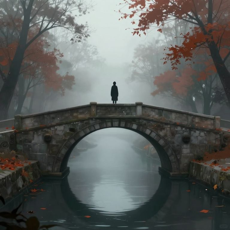 Serenity whispers through the misty arch of a stone bridge, where a solitary figure stands, suspended between the echoes of autumn leaves and the quiet promise of uncharted paths ahead.