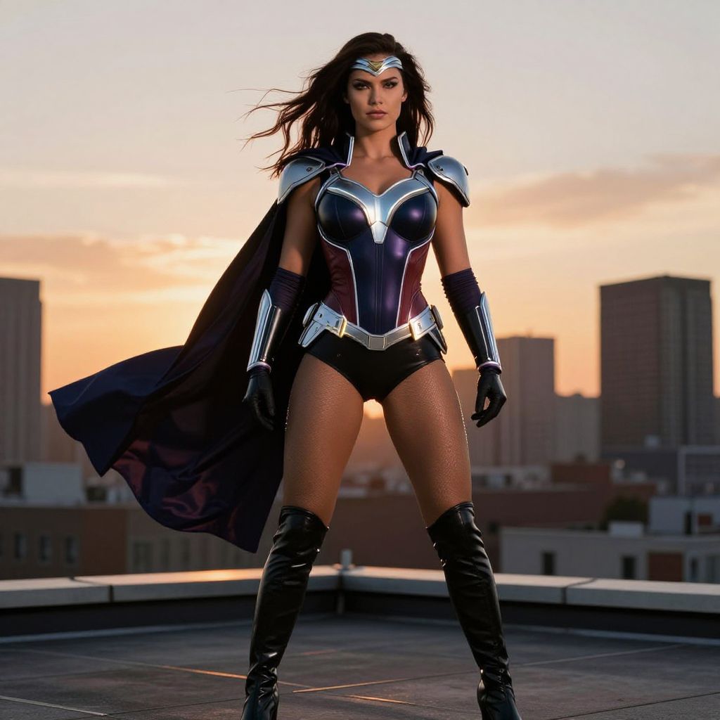 Sexy Powergirl standing confidently on a rooftop at sunset, wearing a sleek, futuristic costume with glowing accents, her cape flowing in the wind, urban skyline in the background, dramatic lighting highlighting her strong pose and determined expression.