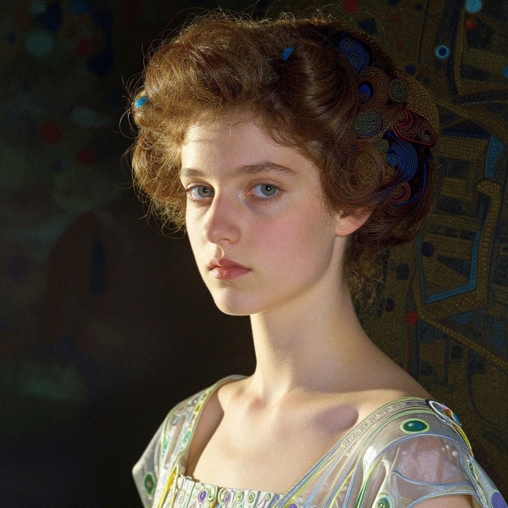 Young girl, Velvia, Realism, graphic print, surreal, klimt, Breakcore, Sunlight, Reflected light, Berlin Secession, delicate, Hellenistic hair styled as French crop, Zentangle, anaglyph effect, elegant dress, face portrait