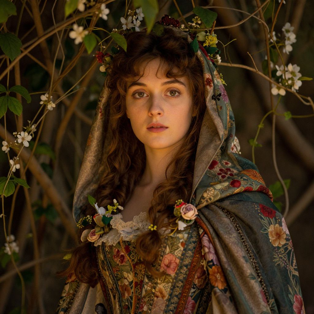 Photorealistic digital portrait of a fair-skinned, young woman with curly brown hair, blue eyes, and delicate features, wearing a translucent, pattern