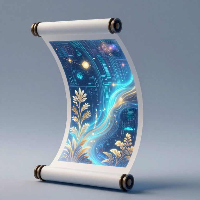 Scrollwork AI depicting a vibrant digital scroll unfurling in mid-air, displaying evolving algorithmic patterns that shift between botanical and cosmic designs, glowing with soft blue and gold light, cyber-art style, futuristic aesthetic, dynamic motion.