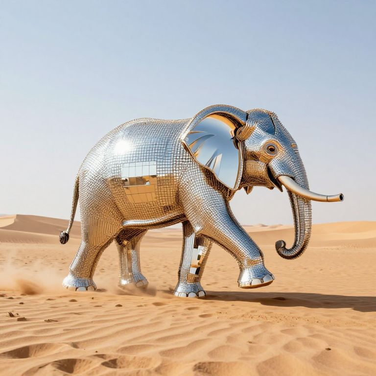 Photograph of a reflective, silver-tiled elephant walking in a sunlit, sandy desert with a clear blue sky in the background.