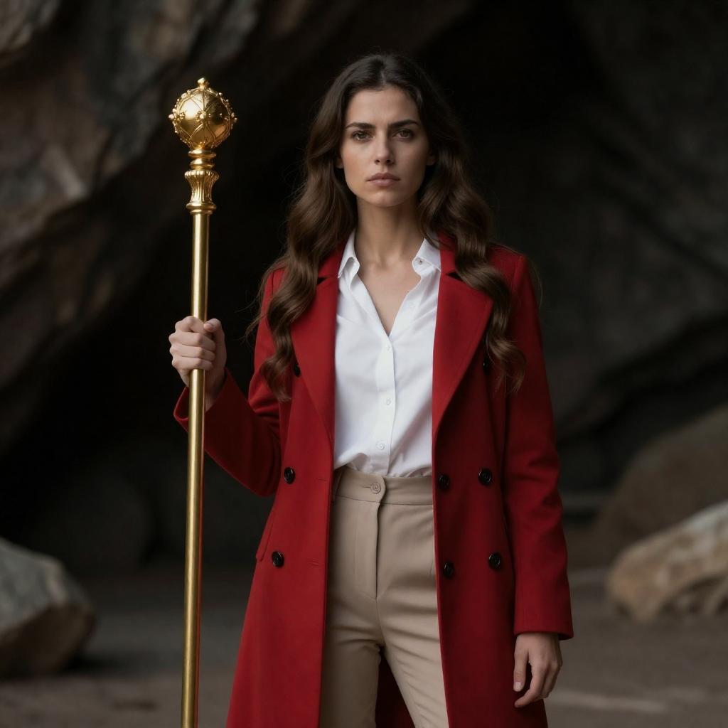 Woman with long brown hair, red coat, white blouse, beige pants, holding a golden staff, dark cave background, serious expression.