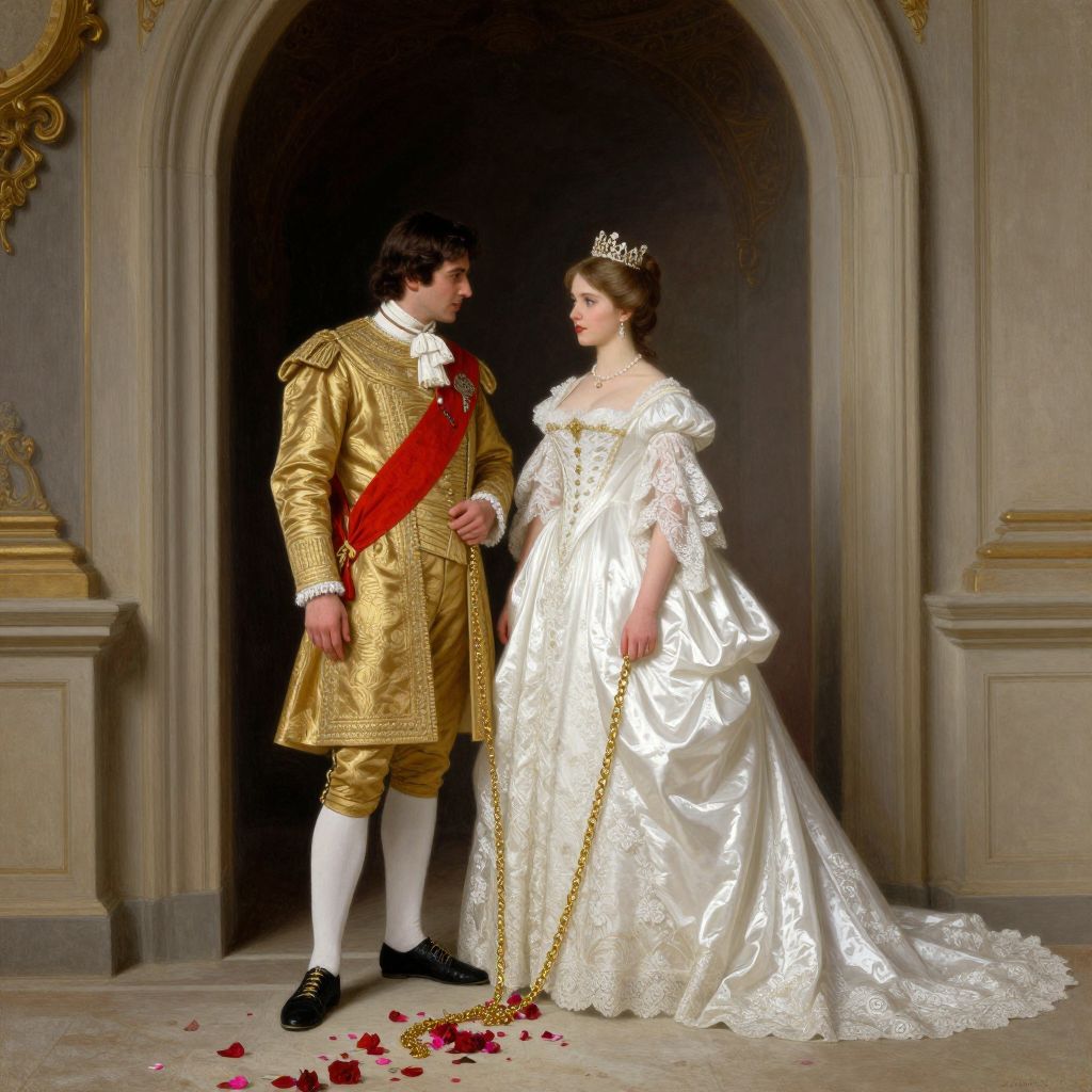 A regal couple stands in an ornate archway, the man in a gold brocade coat and red sash, while the woman wears a pristine white gown adorned with lace and a delicate tiara, as they interact with a golden chain strewn with rose petals on the floor, evoking the romantic and opulent style reminiscent of Edouard Frederic Wilhelm Richter's oil paintings.