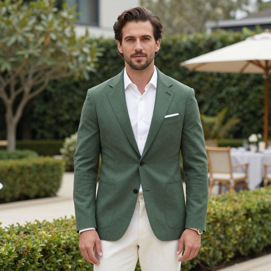 A stylish man stands confidently in a beautifully landscaped garden, showcasing a blend of elegance and casual sophistication. Dressed in a tailored green blazer and white shirt, he exudes charm and approachability, making this image perfect for themes of fashion, lifestyle, and outdoor gatherings.