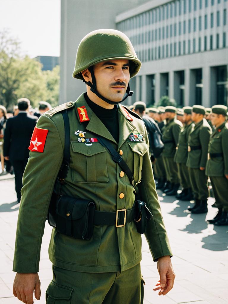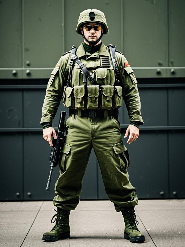 Man in Army-Inspired Olive Green Costume, candid cosplay portrait in daylight