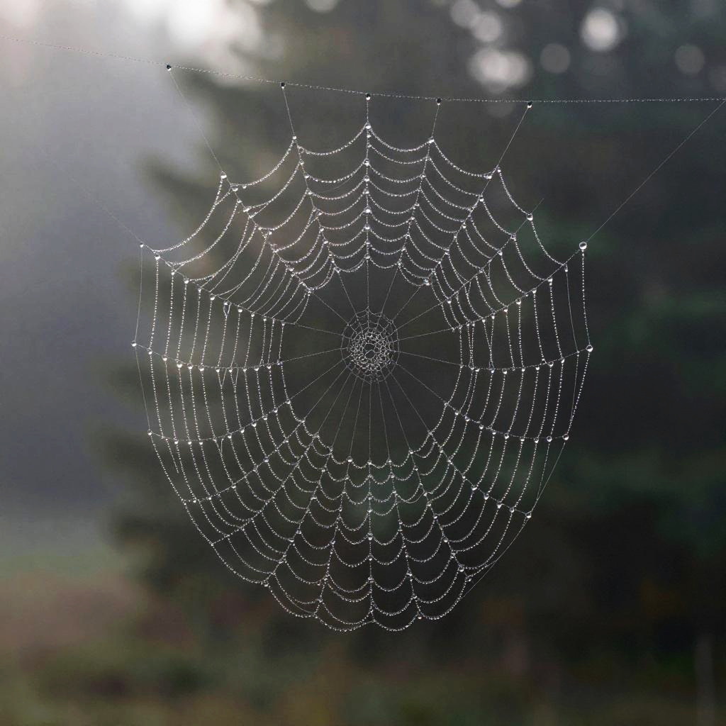 Ronde, a close-up of a perfectly round, dew-covered spider web glistening in the early morning light, set against a blurred forest background with soft bokeh effects, conveying tranquility and natural beauty.