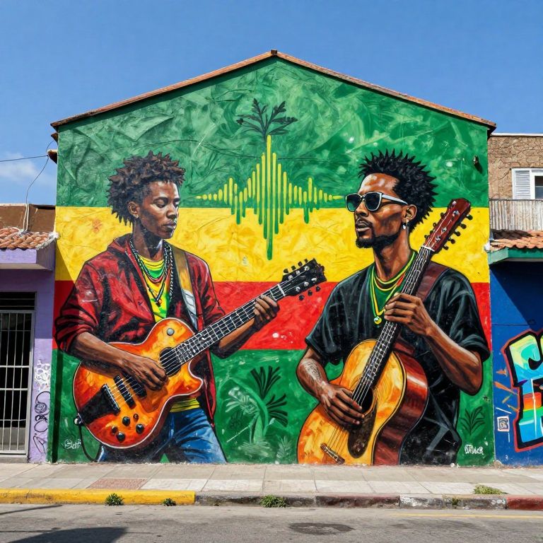Reggae-themed street mural with bold colors and Rastafarian symbols, lively urban neighborhood, sunlit graffiti art featuring iconic reggae imagery, reggae basslines visualized through soundwave patterns, detailed brushstrokes and textures