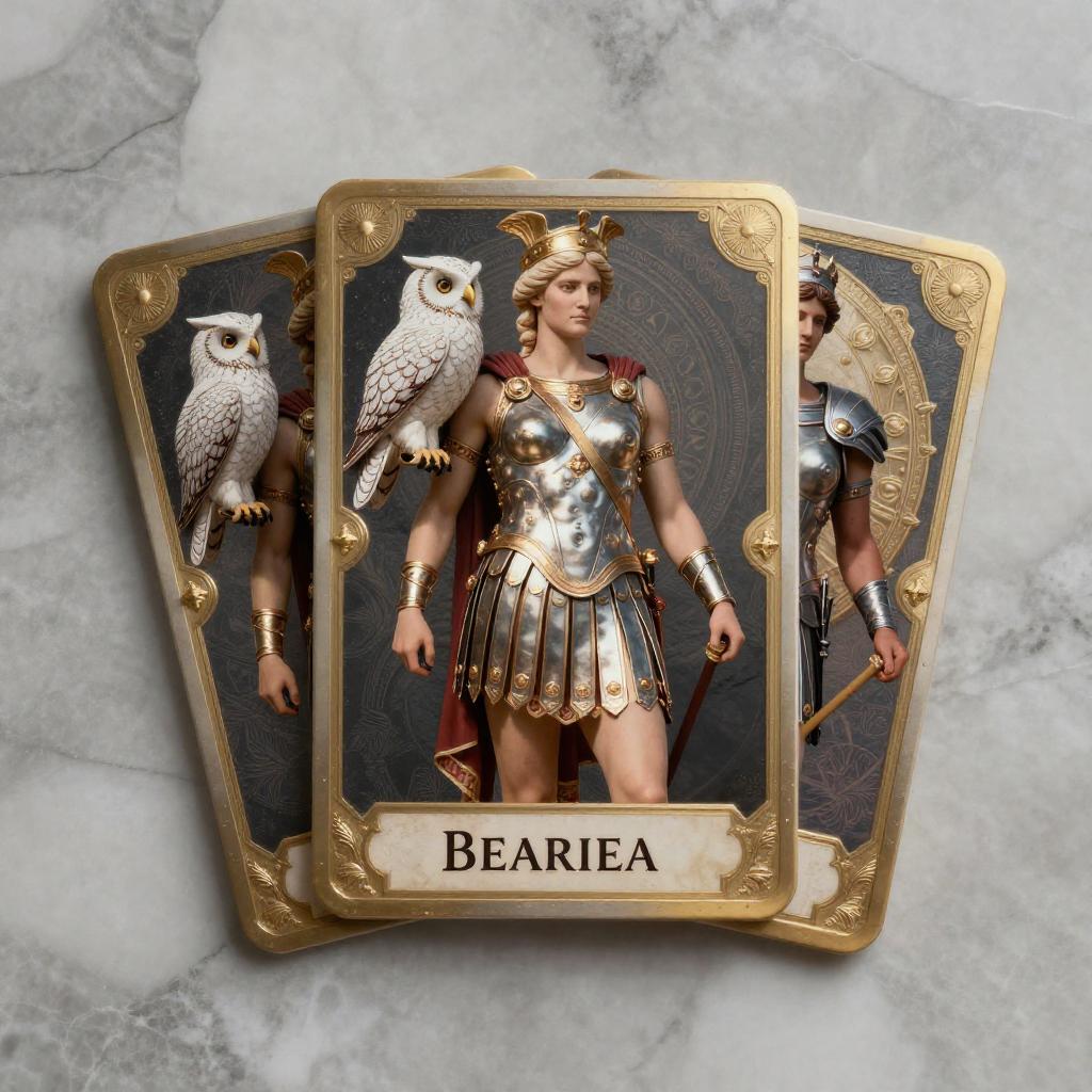 Greek god trading cards showcasing Athena with her owl, classical Greek armor, ancient mythological motifs, marble texture background, cinematic lighting