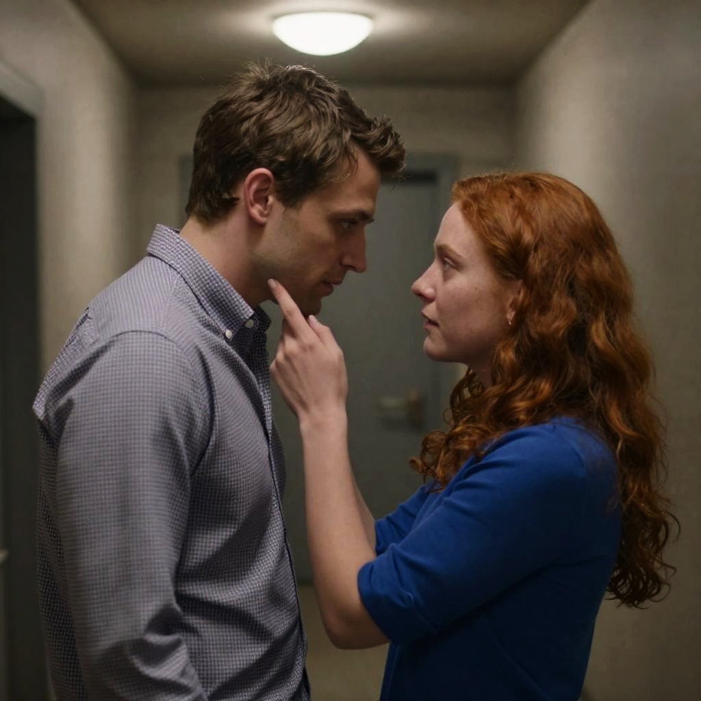 Two men stand face to face inside a dimly lit prison cell with metal bars in the background. The man on the left has short brown hair, a beard, and wears a gray jacket. The man on the right has short dark hair, a lean build, and is dressed in a dark green t-shirt. Both men appear tense and engaged in a serious conversation.