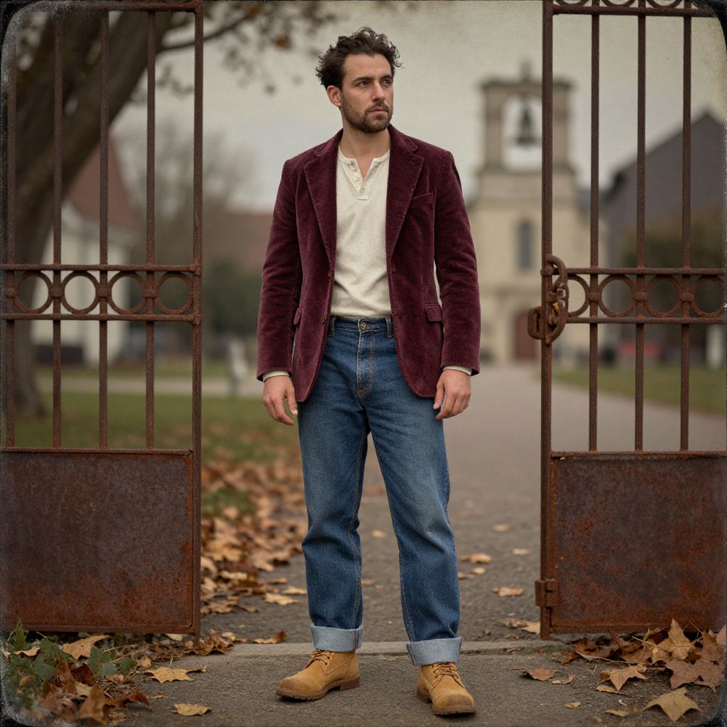 A man, burgundy corduroy blazer, cream henley shirt, relaxed-fit indigo jeans, tan desert boots, contrasting stitching, rusting wrought iron gates, scattered autumn leaves, distant church bells, collodion wet plate style, contemplative expression. Man has masculine face and piercing eyes