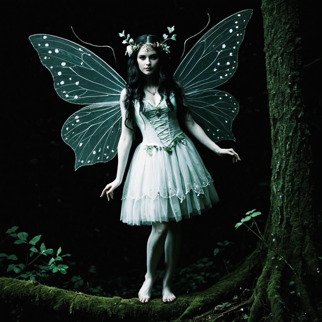 Serendipity full body of a serene woodland nymph, wearing a clear lace short cloth, petite figure, tranquil expression, emerald-green eyes, muted colors, soft lighting, professionally retouched, realistic, high definition, insanely detailed, intricate, elegant, art by Brian Froud, Alphonse Mucha.
