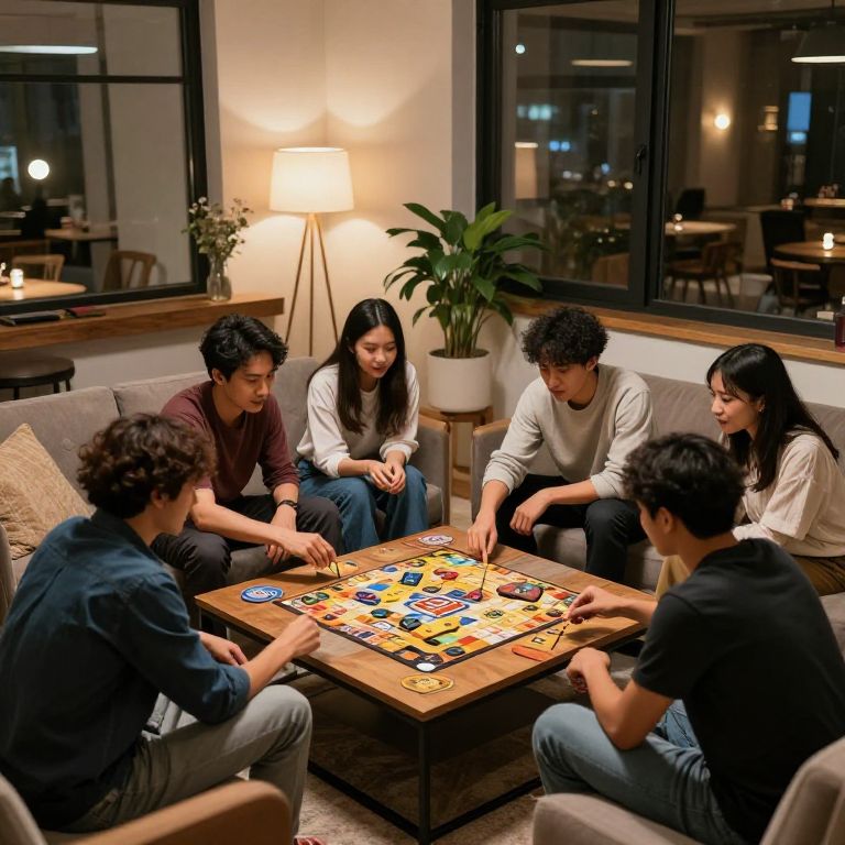 An indoor leisure party in a stylish loft with friends gathered around a coffee table playing board games, soft lighting, comfortable seating, and a relaxed social atmosphere
