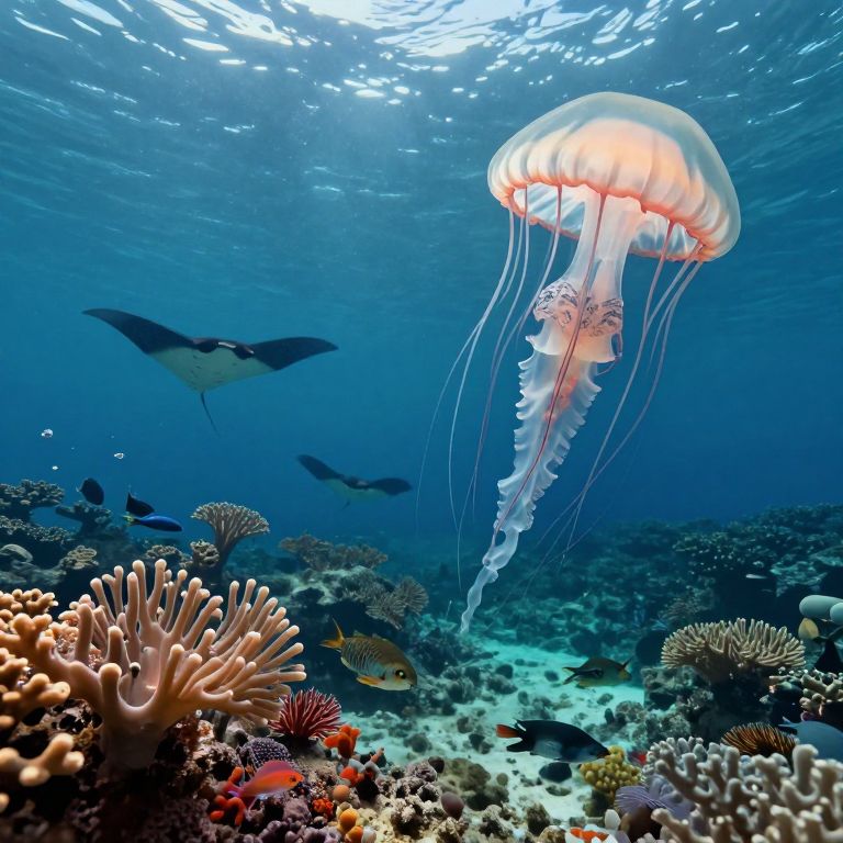 Visualize an enchanting underwater world through the eyes of a glistening jellyfish, gracefully gliding amidst flourishing coral reefs in an impressionistic masterpiece. Soft, impressionistic brushstrokes depict the interplay of light filtering through iridescent turquoise waves, casting intricate shadows on the delicate ocean floor below. Amid this vibrant tapestry of colors emerges a majestic whale skeleton, its weathered bones adorned with thriving coral formations and teeming marine life, creating an alluring fusion of nature's splendor and decay that stirs both awe and reflection.