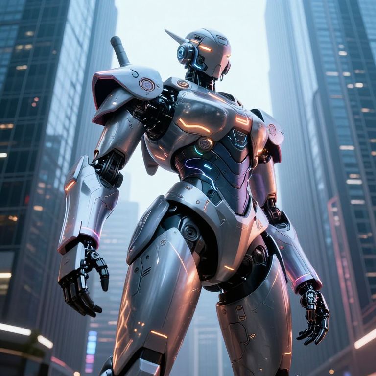 CGI image of a futuristic, humanoid robot standing in a neon-lit urban canyon of skyscrapers. The robot is sleek, metallic, and silver with glowing blue and orange lights tracing its joints and surfaces. It has a muscular build with defined armor plating on shoulders, arms, and legs, and a small, cylindrical protrusion on its back. The background features tall buildings with blue and white lights, creating a high-tech, cyberpunk atmosphere. The robot's head is helmet-like with a single antenna-like appendage on top. The image has a dynamic, low-angle perspective, emphasizing the robot's imposing presence.