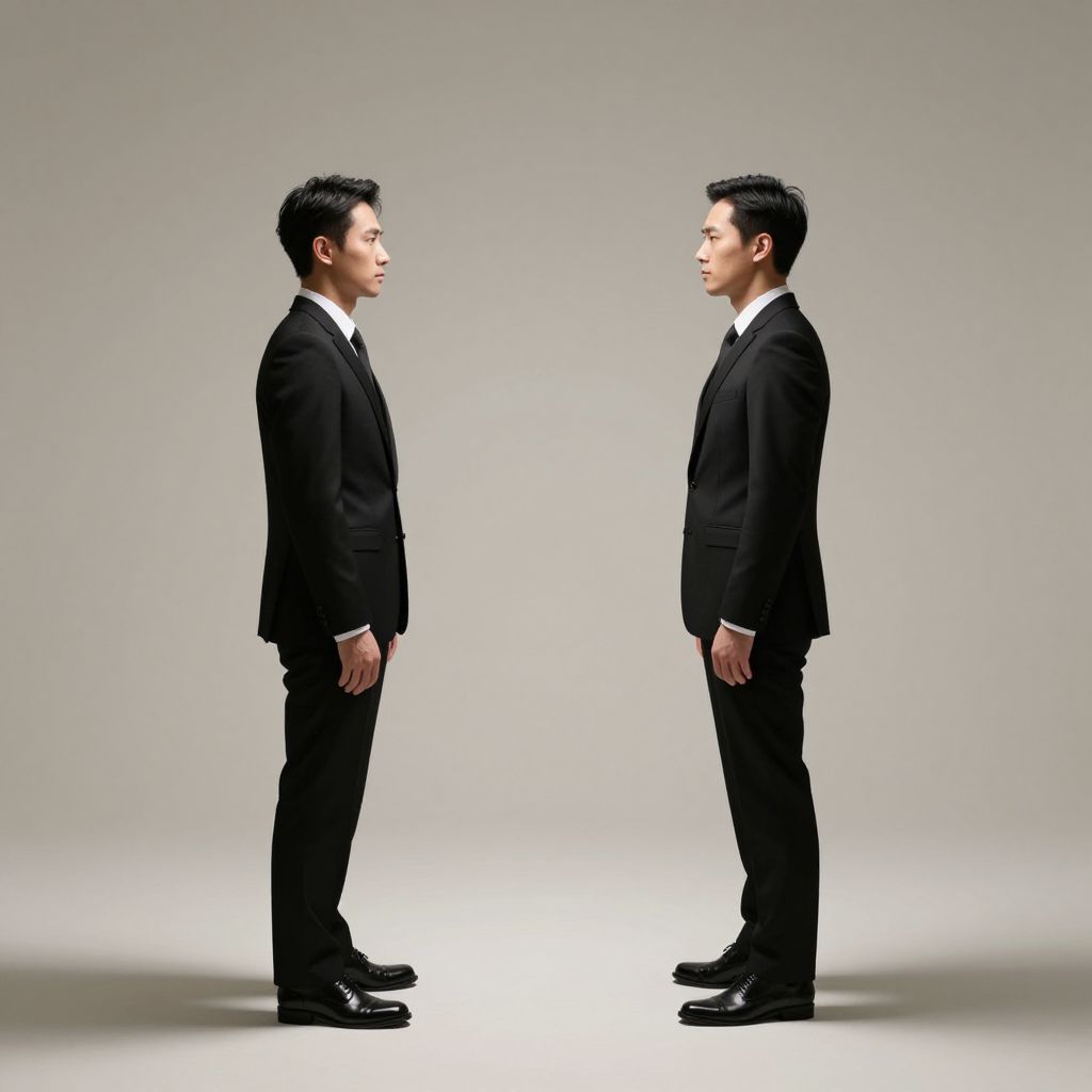 Two identical men in formal black suits stand facing each other against a minimalist backdrop, casting distinct shadows that mirror their symmetrical stance and poised demeanor.
