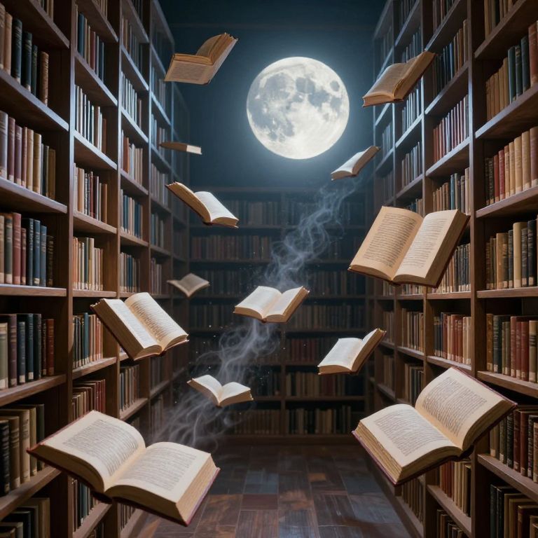 A library with impossible geometry contains floating books that whisper forgotten dreams when opened, their ink vanishing during the day but reforming by moonlight.