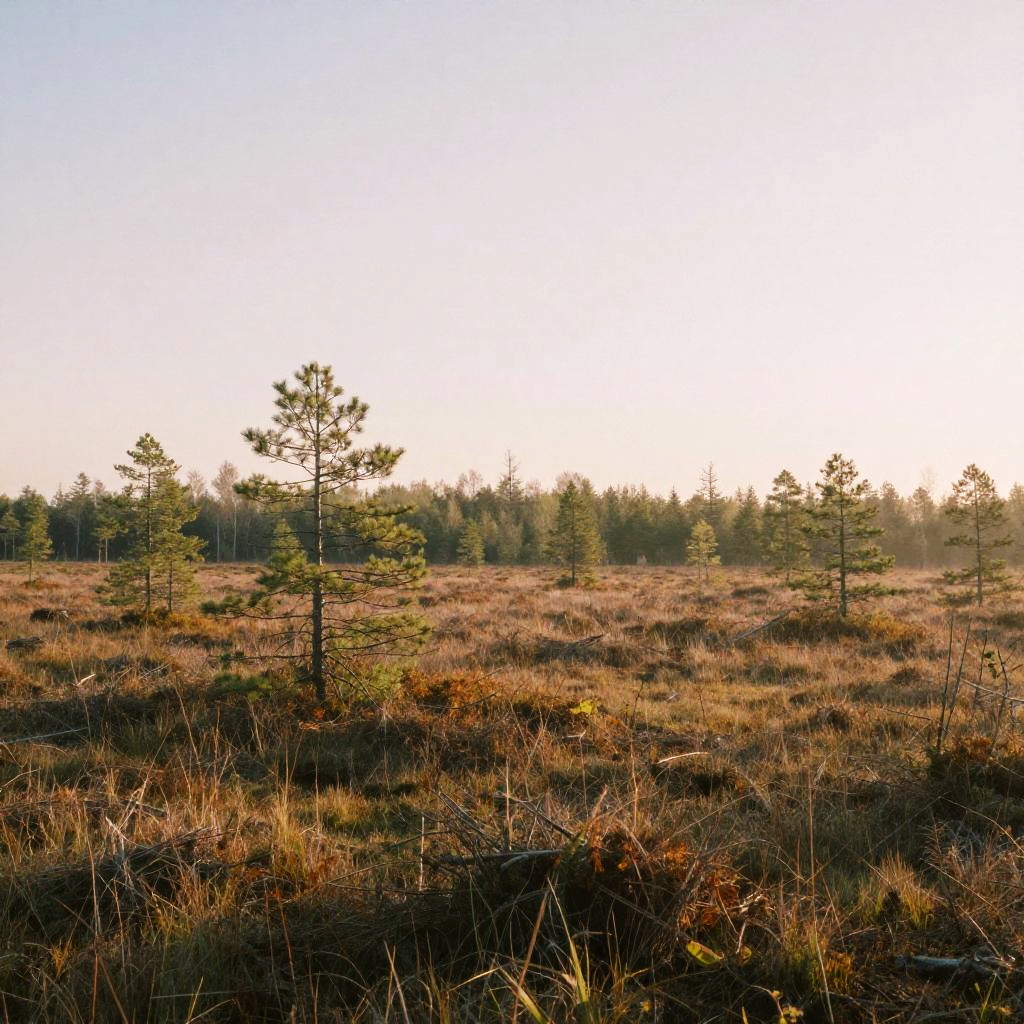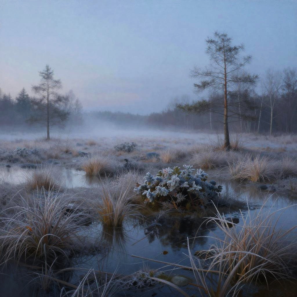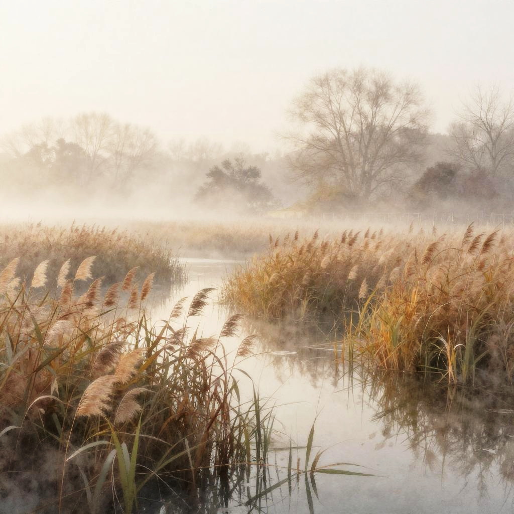 Floodplain Lowlands, sun-dappled bog lands, warming spring breeze, late morning, Soft pastels with subtle gradients