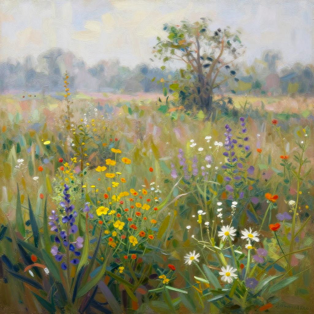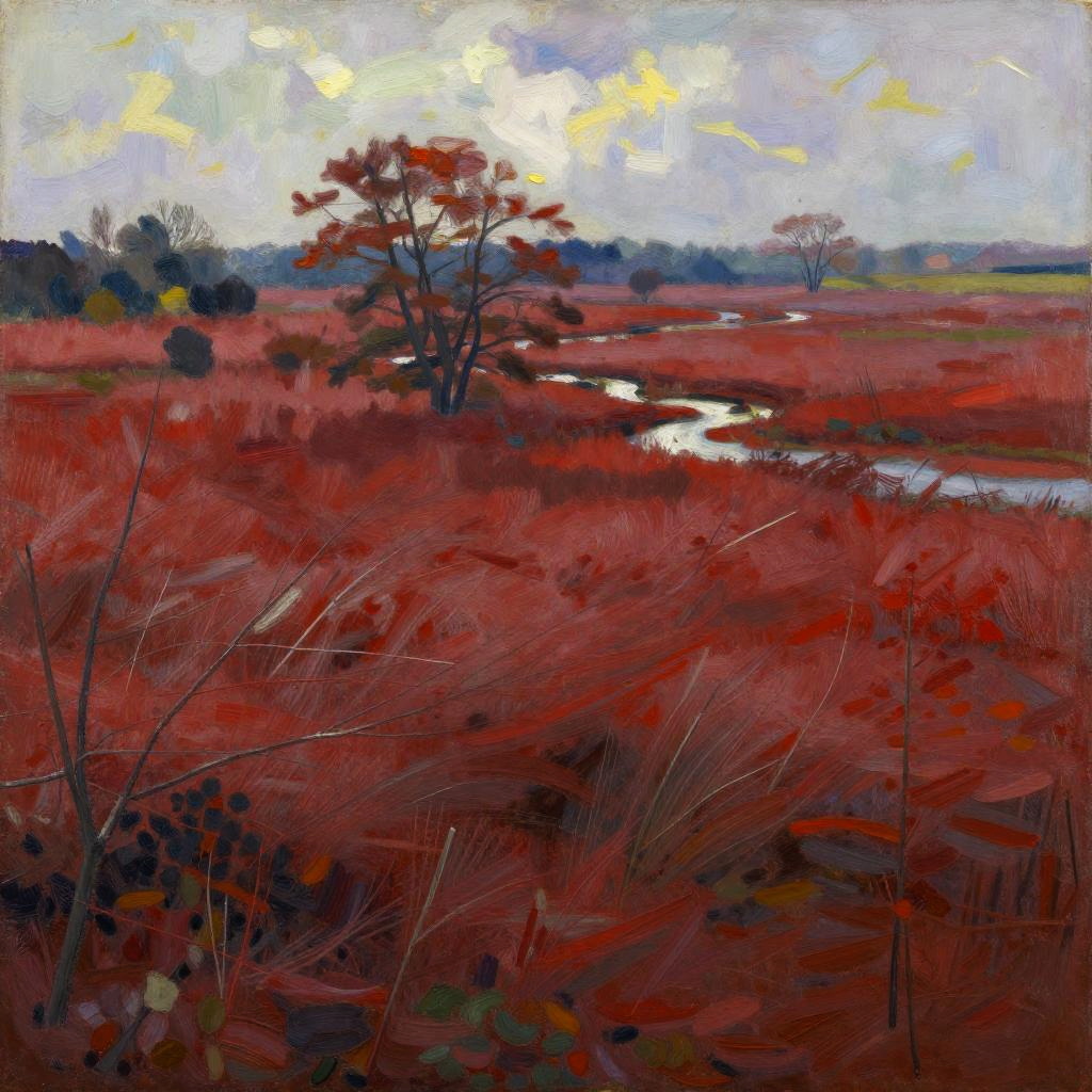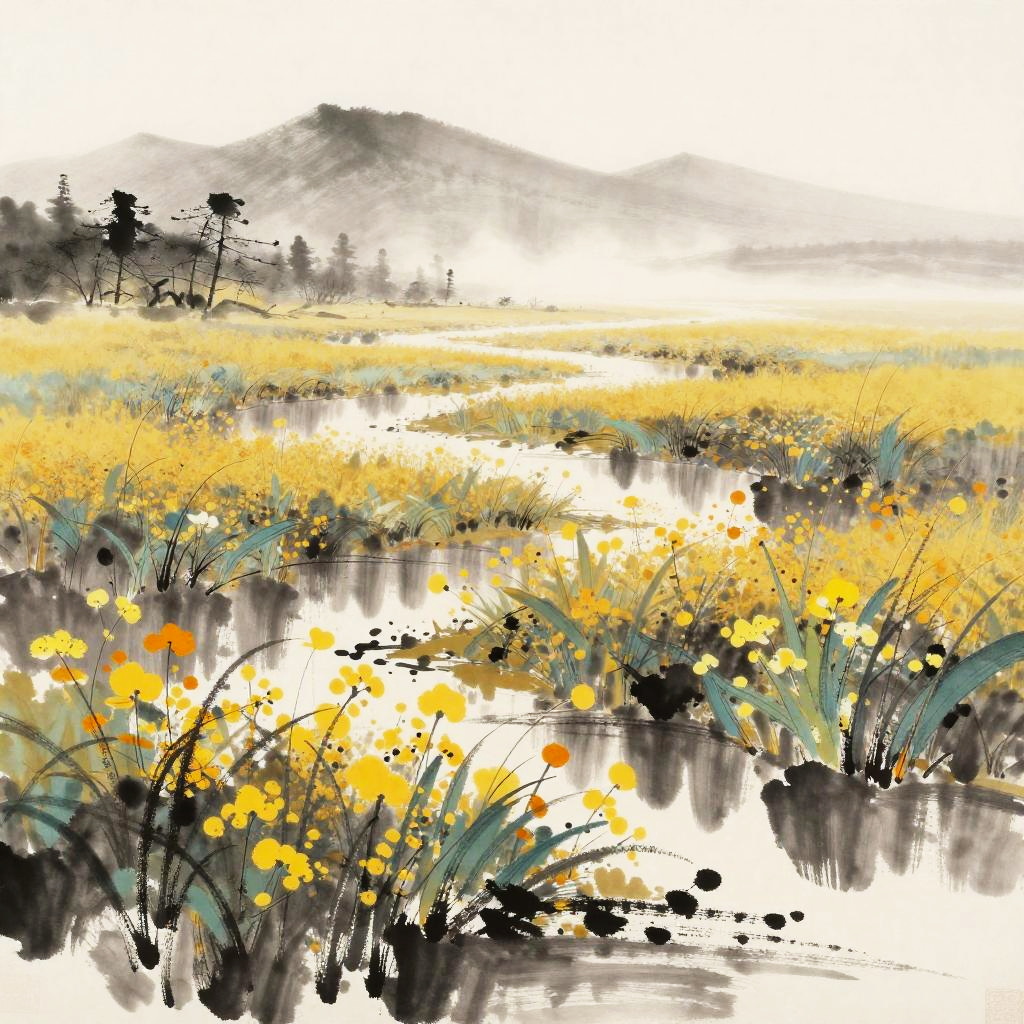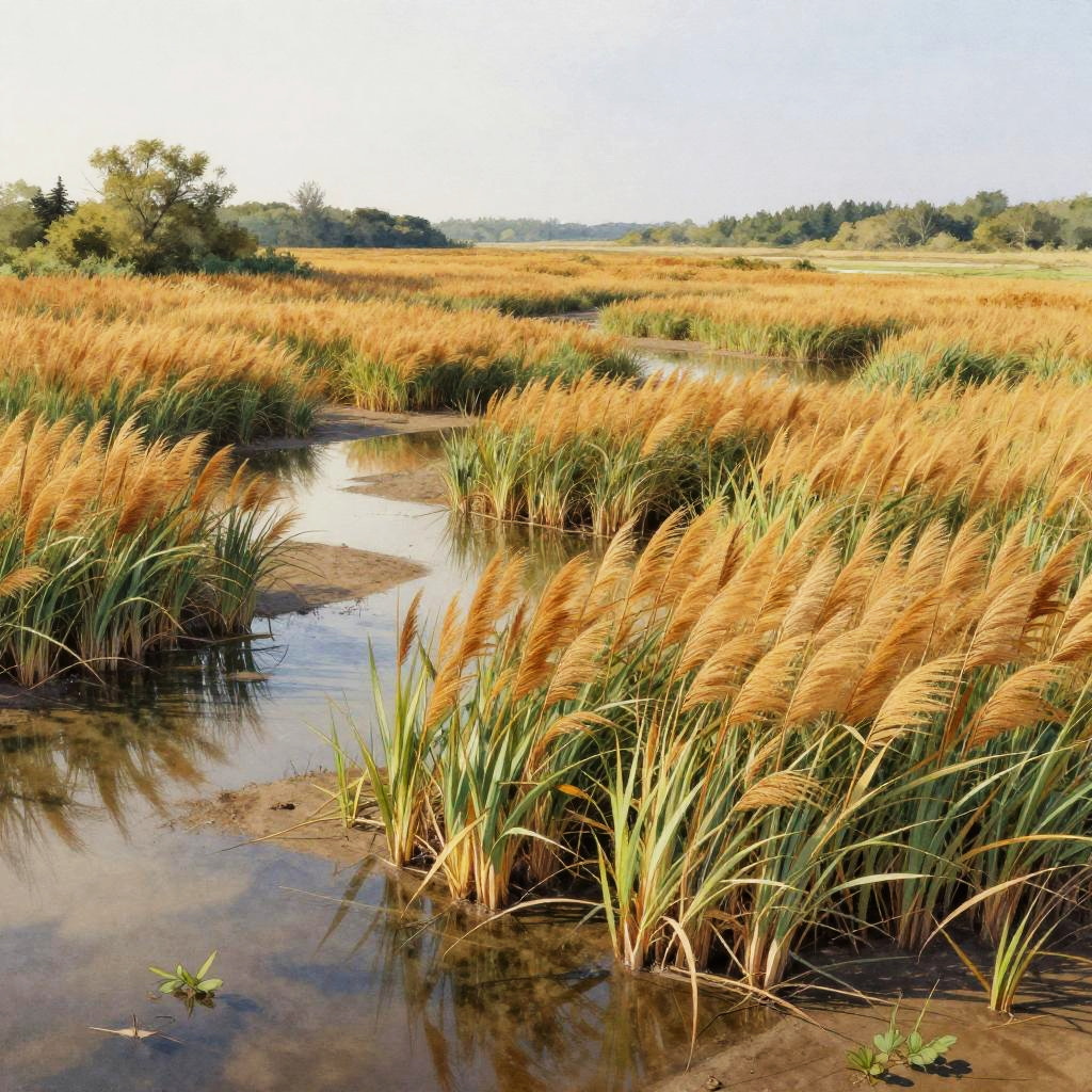 Floodplain Lowlands, sun-dappled bog lands, warming spring breeze, late morning, Soft pastels with subtle gradients