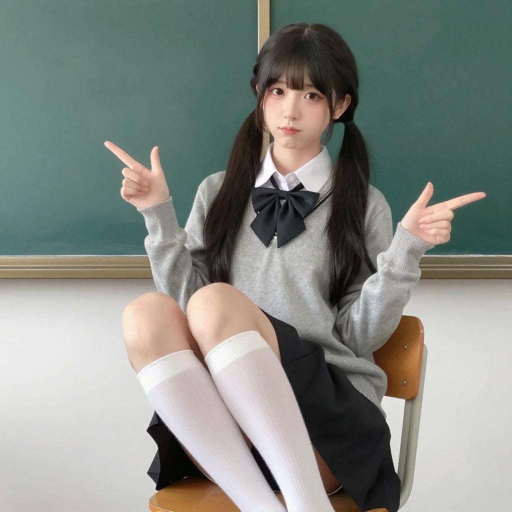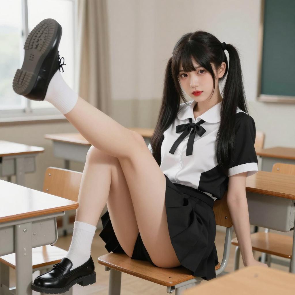 Digital anime-style image of a young woman with long black hair in twin buns, wearing a black and white schoolgirl outfit with a bow, sitting in a classroom. She has pale skin, red lipstick, and is lifting her legs, showing black-soled shoes. She is seated on a wooden desk with white chairs and curtains in the background.
