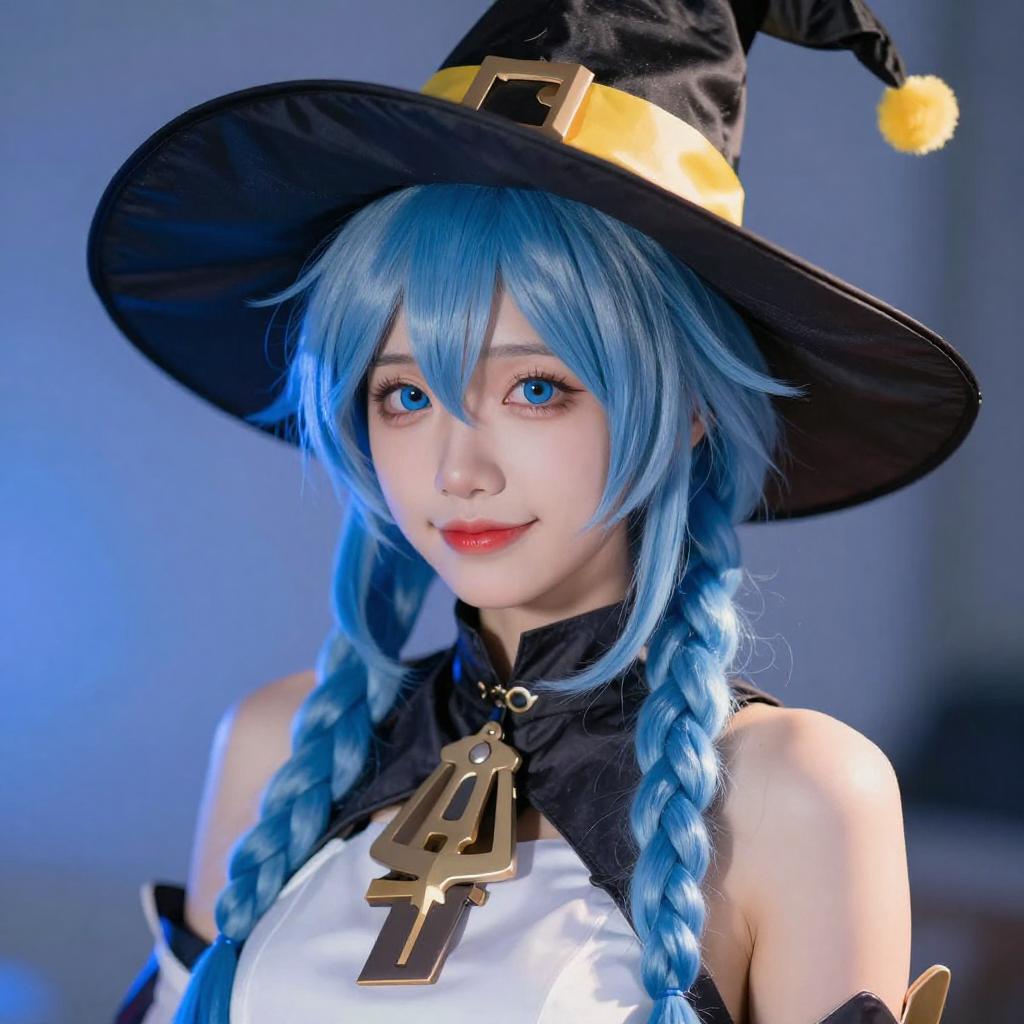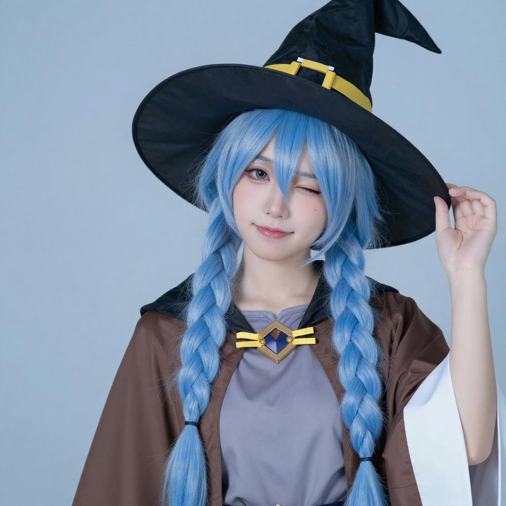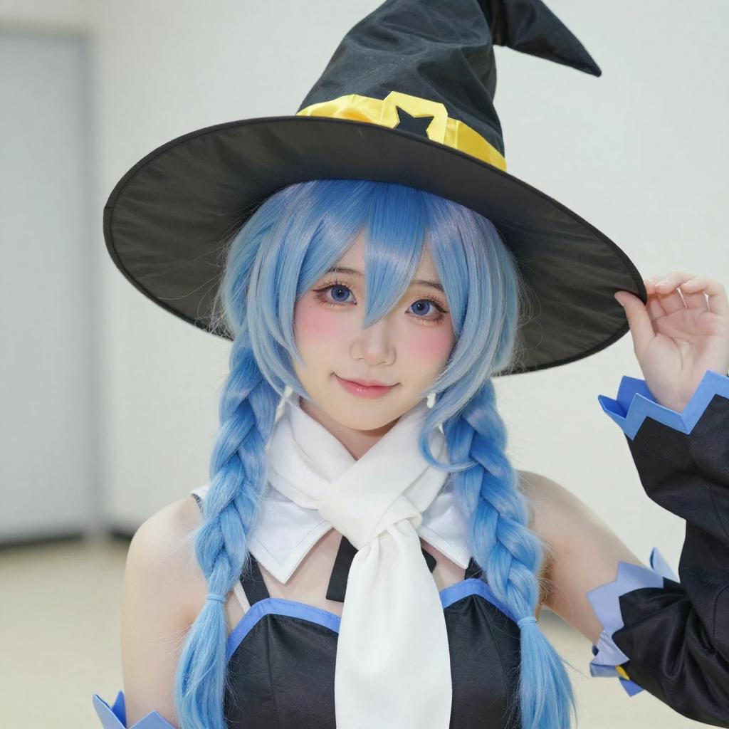 Photograph of a young woman with light blue hair and blue eyes, wearing a black witch hat with yellow accents, a brown and white cape, and a gray outfit with black straps. She holds the brim of her hat with both hands, smiling slightly. The background is a gradient of blue and white.
