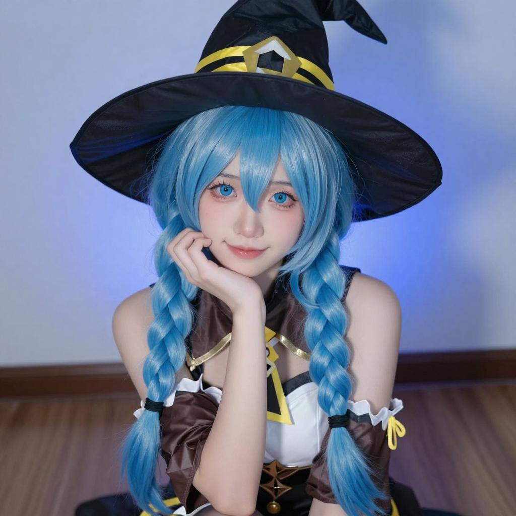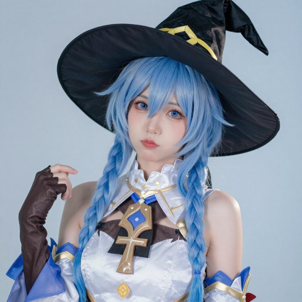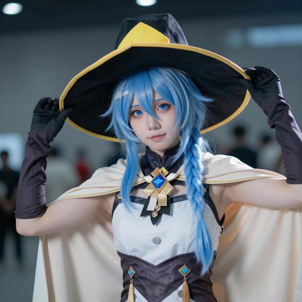 Photograph of a young woman with light blue hair and blue eyes, wearing a black witch hat with yellow accents, a brown and white cape, and a gray outfit with black straps. She holds the brim of her hat with both hands, smiling slightly. The background is a gradient of blue and white.