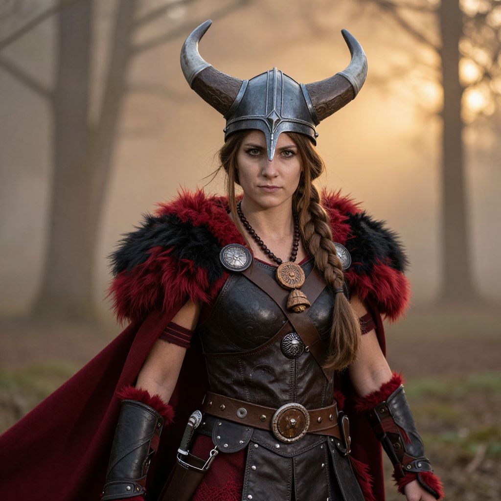 A realistic photography of a cosplay girl wearing a detailed Viking costume, with flowing red and black fur cloak, a leather armor chest piece, a wooden necklace, and a large horned helmet, standing in a misty forest at dusk with golden-hour lighting, her facial expression focused and confident, natural skin tone, long brown hair tied in a braid, eyes slightly narrowed in determination