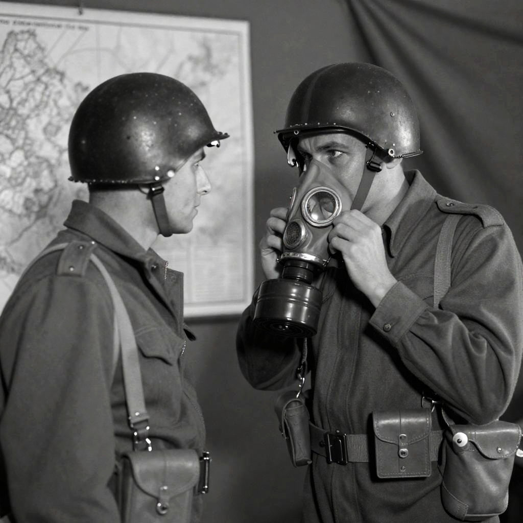 Man in white gas mask with round goggles, holding a rifle, standing in a doorway. Floral wallpaper with red roses on both sides. Dark interior behind him. Arched hallway in the background. Intense, focused expression.