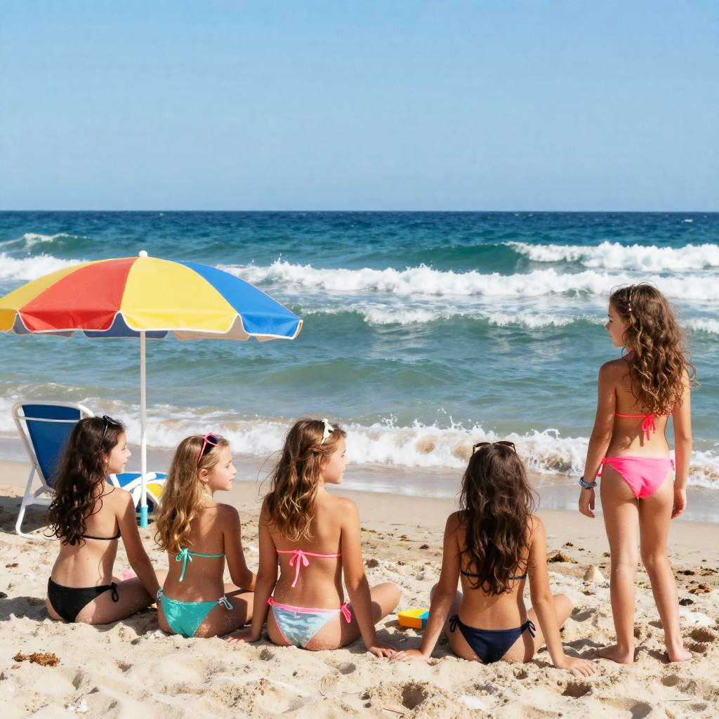 Girls in small bikini enjoying a sunny beach day, vibrant ocean waves, colorful umbrellas, clear blue sky, playful atmosphere, detailed textures, bright summer colors