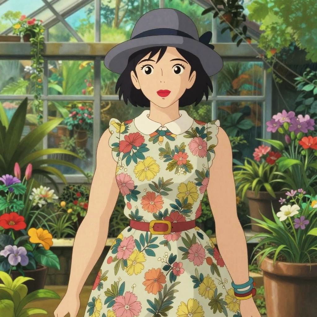 A lanky woman in a vintage-inspired, floral A-line dress with a Peter Pan collar and a gray felt fedora, red lipstick, and layered bracelets, stands in a subtropical greenhouse, surrounded by lush greenery and vibrant flowers, in the style of Kyoto Animation. Sexy. Pretty face and beutiful eyes