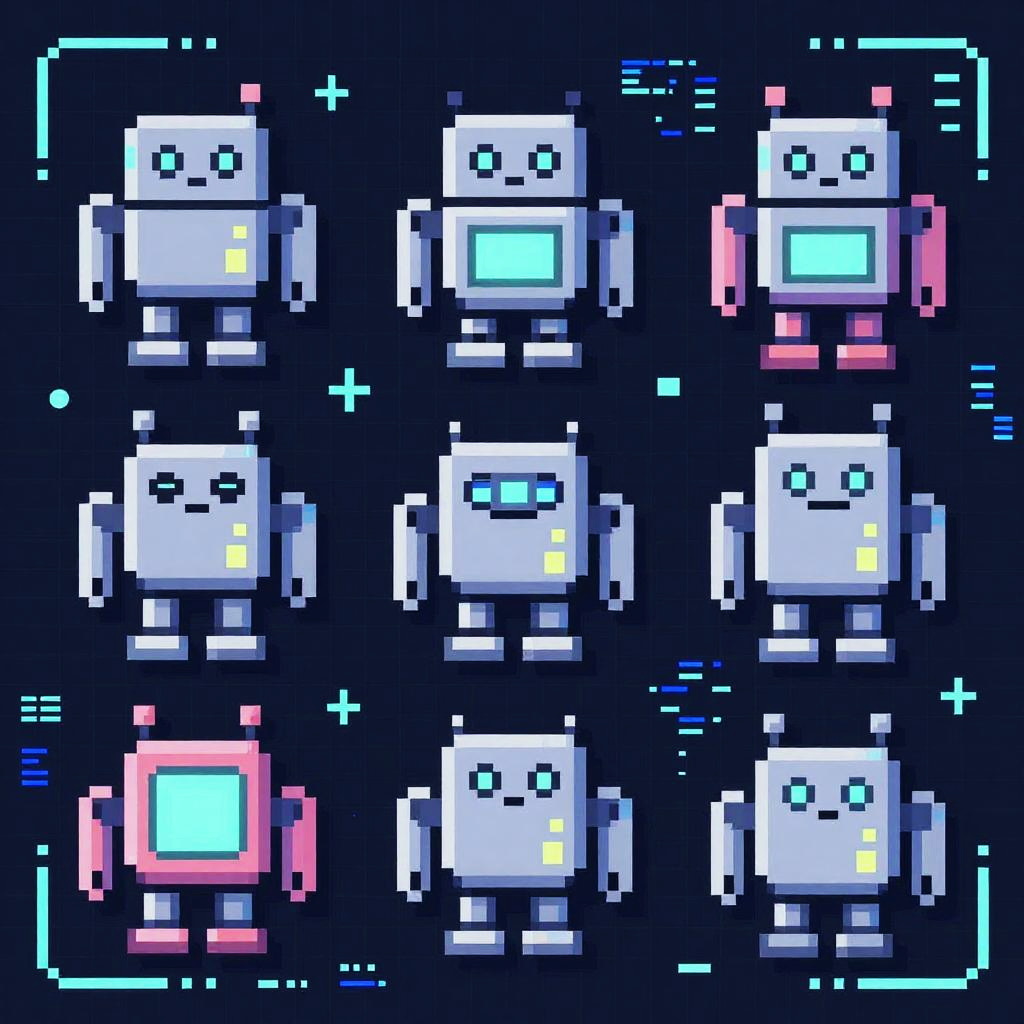 2d sprite generator themed around sci-fi pixel robots being developed, modular mechanical sprites in pixel art style with neon highlights, tech-inspired UI elements, glowing grids and coding symbols in the background, sharp and polished, blending retro and futuristic aesthetics