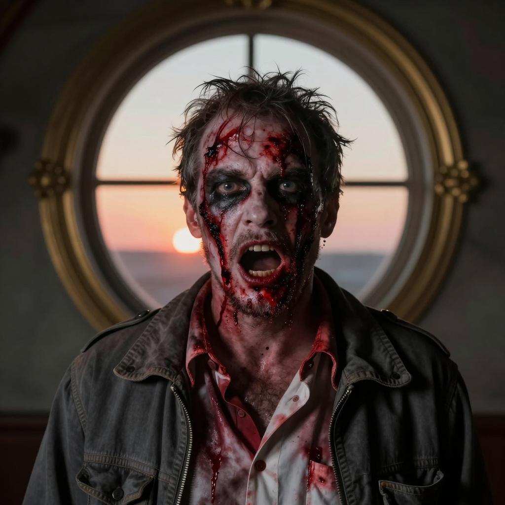 Man with pale face and short red hair wears dark blue hoodie with autumn leaves. Holds large kitchen knife in right hand. Background has autumn leaves, dark building. Black shadow on left. Intense expression. Mid-action pose. Autumn theme.