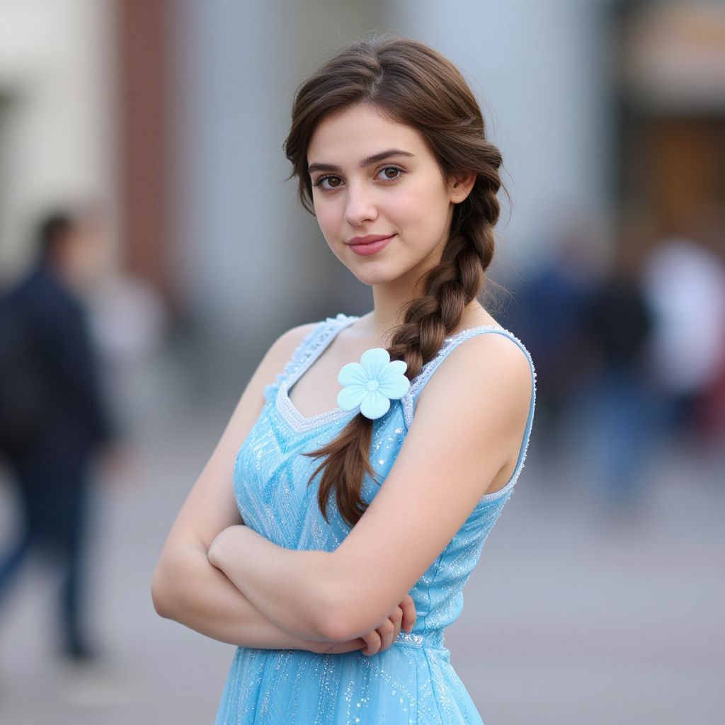 "damart woman wear costume, 1girl, solo, braid, long hair, brown hair, brown eyes, realistic, blurry background, blurry, looking at viewer Realistic photo of casual sexy person with pretty face"