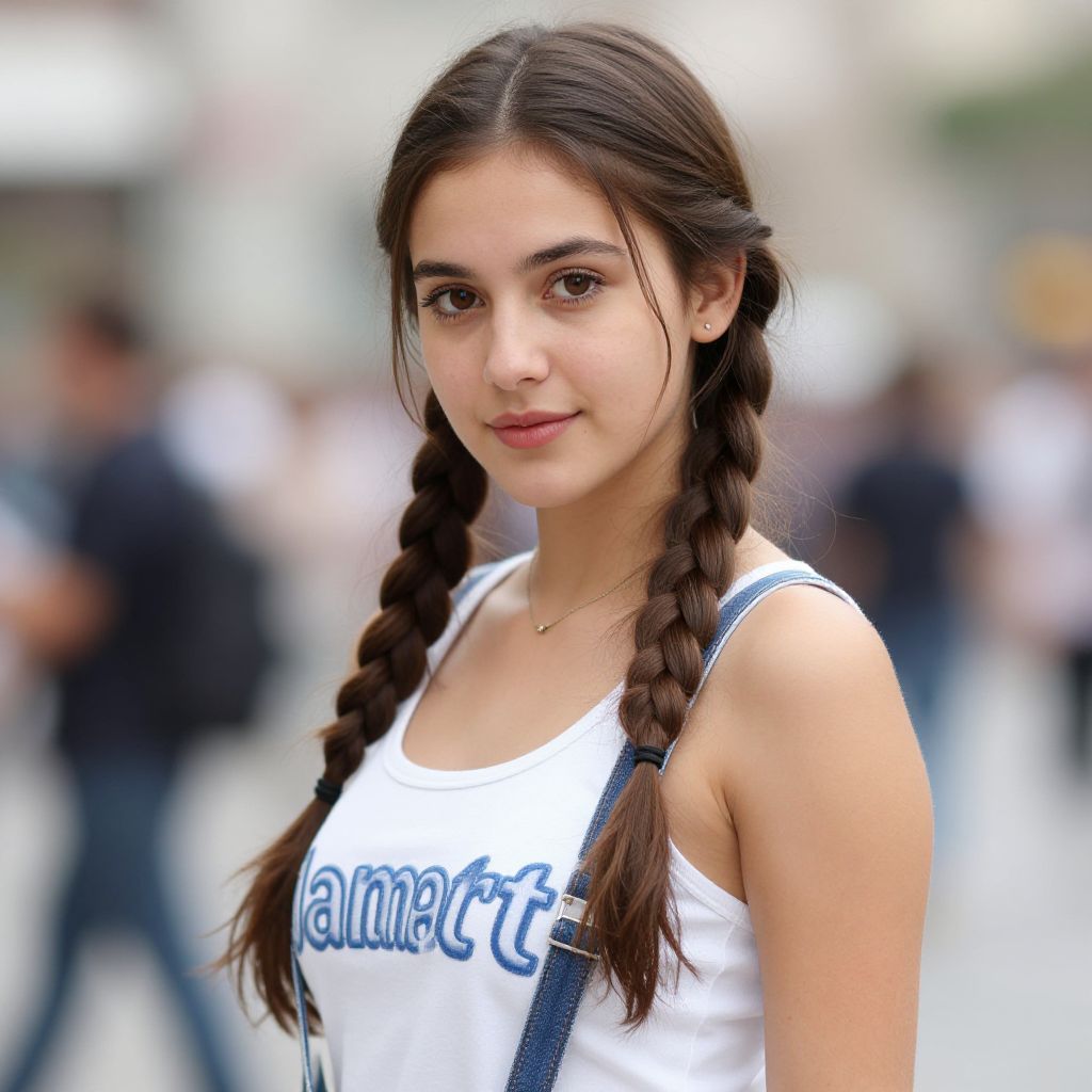 Photograph of a young woman with medium-light brown skin and long, dark brown hair in two braids. She has dark, arched eyebrows, brown eyes, and a subtle smile. She wears a white tank top with blue text and a thin gold necklace. The background is blurred, showing an outdoor urban setting with indistinct people and buildings. The lighting is natural, highlighting her clear complexion and dark hair. She has a slender build and is looking directly at the camera. The overall style is casual and youthful.